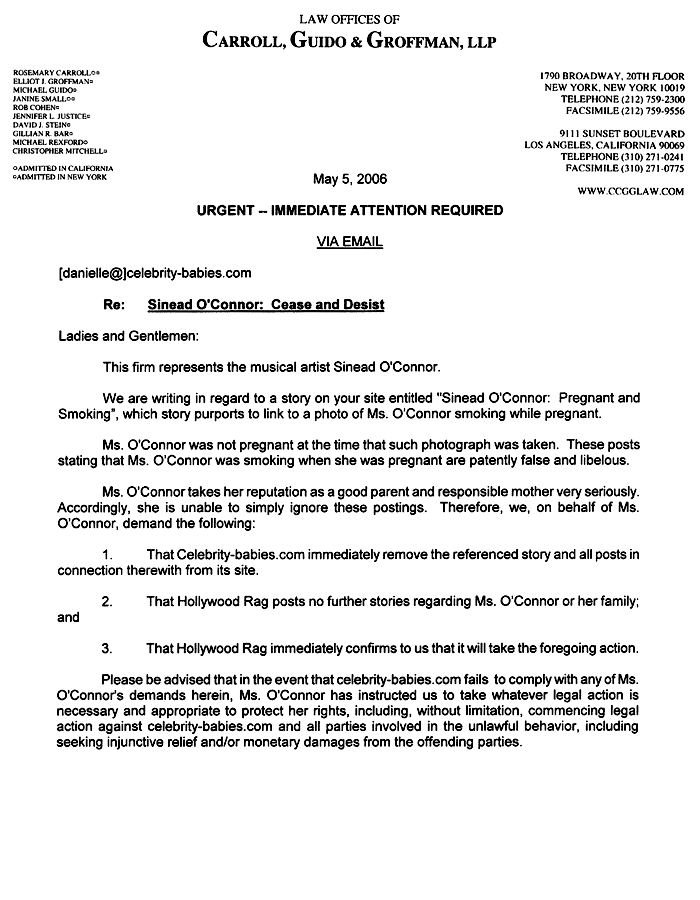 Sinead: I Wasn't Puffing While Pregnant Singer says online reports libelous, a bald-faced lie [The Smoking Gun 10 May 2006] 17 May 2006, 20:30
